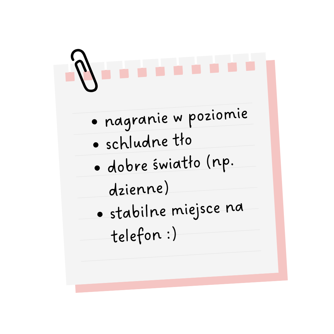 Techniczne aspekty też są ważne. Nagrywaj w poziomie, a nie w pionie. Fajnie, gdyby wideo były dobrej jakości, dobrze oświetlone, na czystym, schludnym tle, bez bałaganu. Najlepiej sprawdzają się nagrania w świetle dziennym, bez sztucznych filtrów. Polecam też ustawić telefon w stabilnej pozycji, tak jest po prostu łatwiej 🙂